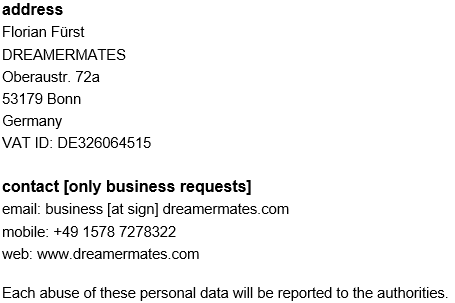 This website and the associated database contain materials created, developed, designed or commissioned by DREAMERMATES, and are protected by European and international copyright and trademark laws. No material (including but not limited to the names, text, logos, images, audio, and/or video) and no software and mobile applications (including but not limited to any images or files incorporated in or generated by the software application) may be copied, reproduced, republished, uploaded, posted, transmitted, or distributed in any way. In connection with such use, you may not modify or obscure any copyright or other proprietary notice. Modification or other use of these materials without DREAMERMATES’s prior written consent is a violation of DREAMERMATES’s proprietary rights.